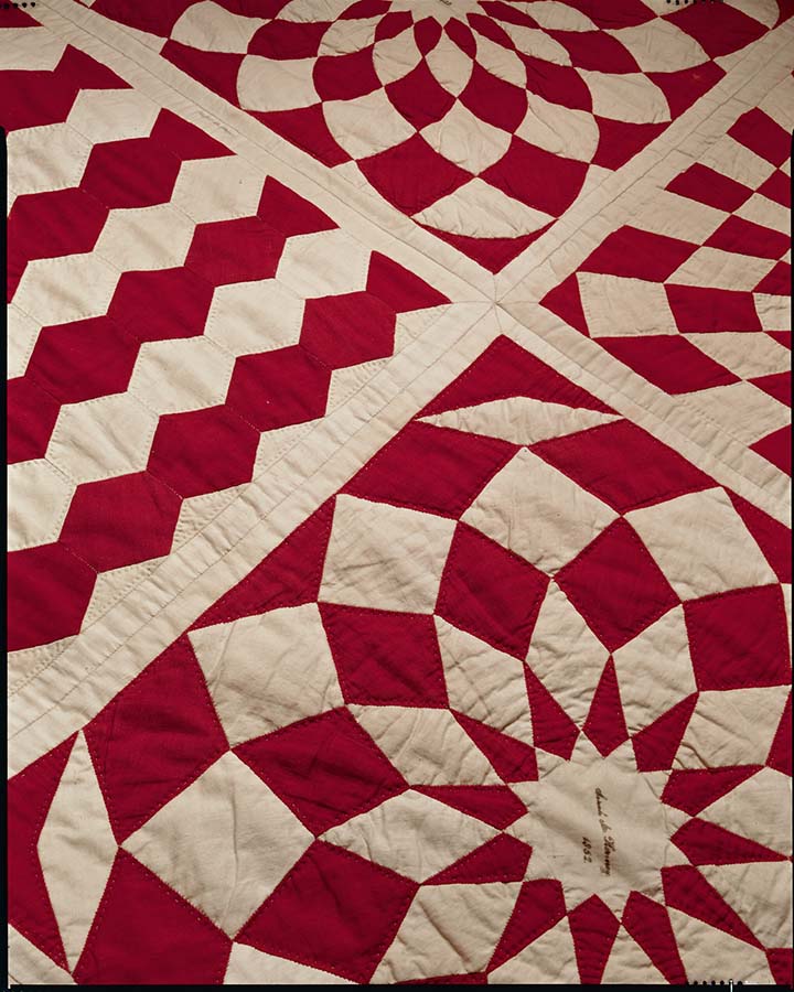 In eighteenth- and nineteenth-century New England, while men were building communities through fraternal organizations or at the tavern, women's communities centered on the church, on charitable works, and on sewing and reading circles. Joining neighbors for a day of quilting was a highlight of the season for many New England women. So-called "friendship" quilts came into vogue in the 1840s. This was a time of extensive migration in America, with families moving west, or leaving their farms for opportunities in mill towns and cities. These quilts were often given as remembrances to departing neighbors. Friendship quilts contain squares with stitched or inked signatures. The point was to offer a token of affection to the recipient. This red and white quilt was made between 1851 and 1853 by members of the Howard Sunday School of the Bulfinch Street Church of Boston, apparently for Sunday School teacher Francis Cogswell Manning. The quilt may have been a gift marking Manning's anniversary as a teacher at the Sunday School. A note by Francis Manning that survives reads: "You have taken me entirely by surprise, fellow teachers [and friends], by this unexpected mark of your favor, and I feel entirely unable to give expression, in any fitting words, to the feelings your kindness has awakened in my heart."