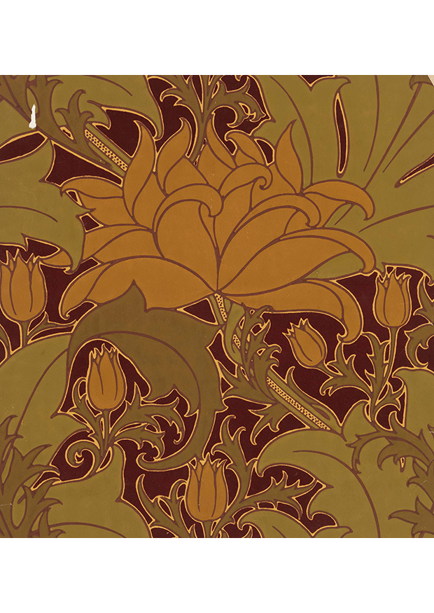 C.F.A. Voysey Wallpaper A founder of the Arts and Crafts Movement, architect and designer Charles Francis Annesley Voysey created wallpaper patterns of whimsical simplicity incorporating stylized depictions of the natural world. This unused ca. 1893 sample in the Historic New England collection is a good example of Voysey’s stylization, with a large-scale flower surrounded by leaves and flower buds. Printed in olive, two greens and gold on a crimson flocked background. A response in part to the Industrial Age, the Arts and Crafts movement began in late nineteenth century Great Britain and spread to America. The Arts and Crafts movement had varied modes of expression unified by the characteristics of devotion to craftsmanship, marriage of beauty and utility, and inspiration from the natural world.