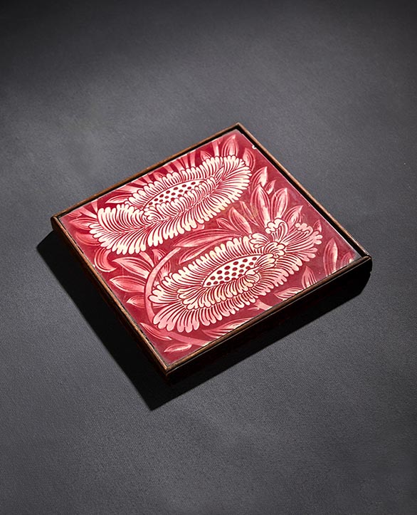 De Morgan, William Frend (1839-1917) This ceramic tile with a design of sunflowers and leaves in rose lustre and white, and enclosed in a wooden frame, is attributed to William De Morgan (1839 – 1917), a leading innovative designer of the Arts and Crafts Movement. Images of sunflowers proliferated the decorative arts in England and America in the 1880s. Their association with lasting happiness and adoration made them a favorite for both the Aesthetic and Arts and Crafts Movements. Sunflower motifs were featured on wallpaper designed by William Morris, on fireplace tiles by William De Morgan, and in newspaper illustrations showing the bon vivant Oscar Wilde, a central character in the aesthetic movement. Trained as a fine artist, William De Morgan became interested in the decorative arts as a young man, embarking on a lifelong friendship with William Morris. Turning his attention from painting to stained glass, pottery, and tile design, De Morgan was led by his scientific curiosity to rediscover and innovate the lustrework technique found in Hispano-Moresque pottery, which incorporated Islamic and European elements, and maiolica, Italian Renaissance pottery. His work was influenced in color and design by Iznik ware motifs and featured stylized depictions of nature interwoven with geometric patterns. Best known for his work in ceramics, De Morgan also designed furniture and later wrote a series of popular novels.Happy Motif