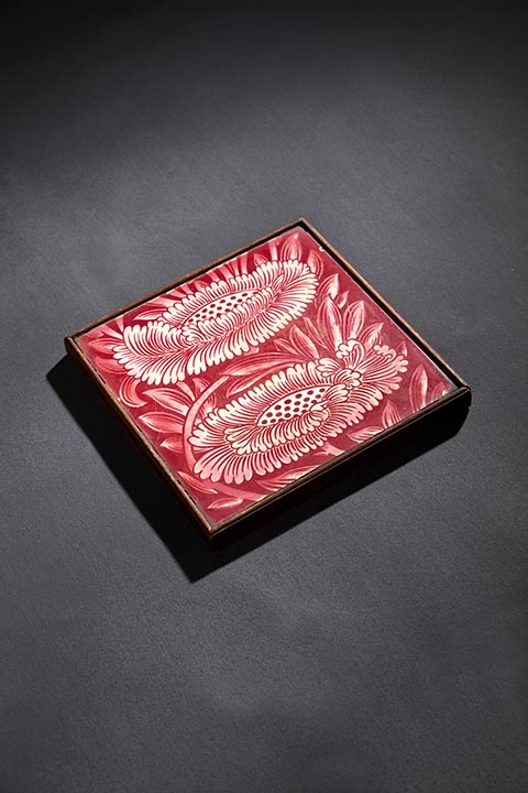 De Morgan, William Frend (1839-1917) This ceramic tile with a design of sunflowers and leaves in rose lustre and white, and enclosed in a wooden frame, is attributed to William De Morgan (1839 – 1917), a leading innovative designer of the Arts and Crafts Movement. Images of sunflowers proliferated the decorative arts in England and America in the 1880s. Their association with lasting happiness and adoration made them a favorite for both the Aesthetic and Arts and Crafts Movements. Sunflower motifs were featured on wallpaper designed by William Morris, on fireplace tiles by William De Morgan, and in newspaper illustrations showing the bon vivant Oscar Wilde, a central character in the aesthetic movement. Trained as a fine artist, William De Morgan became interested in the decorative arts as a young man, embarking on a lifelong friendship with William Morris. Turning his attention from painting to stained glass, pottery, and tile design, De Morgan was led by his scientific curiosity to rediscover and innovate the lustrework technique found in Hispano-Moresque pottery, which incorporated Islamic and European elements, and maiolica, Italian Renaissance pottery. His work was influenced in color and design by Iznik ware motifs and featured stylized depictions of nature interwoven with geometric patterns. Best known for his work in ceramics, De Morgan also designed furniture and later wrote a series of popular novels.Happy Motif